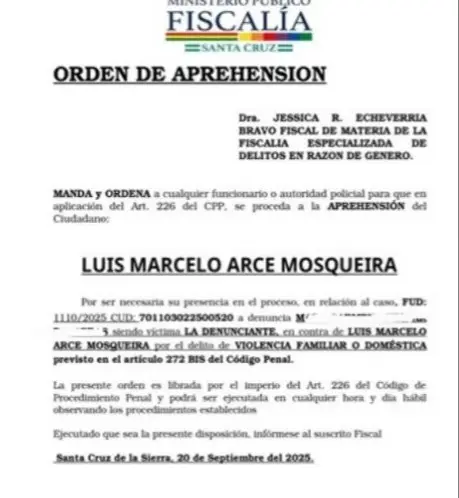El director nacional de Interpol, Juan Carlos Bazoalto, informó este miércoles que se activó la notificación de sello rojo contra Marcelo Arce Mosqueira, quien enfrenta un proceso por violencia familiar y cuenta con una orden de aprehensión vigente.