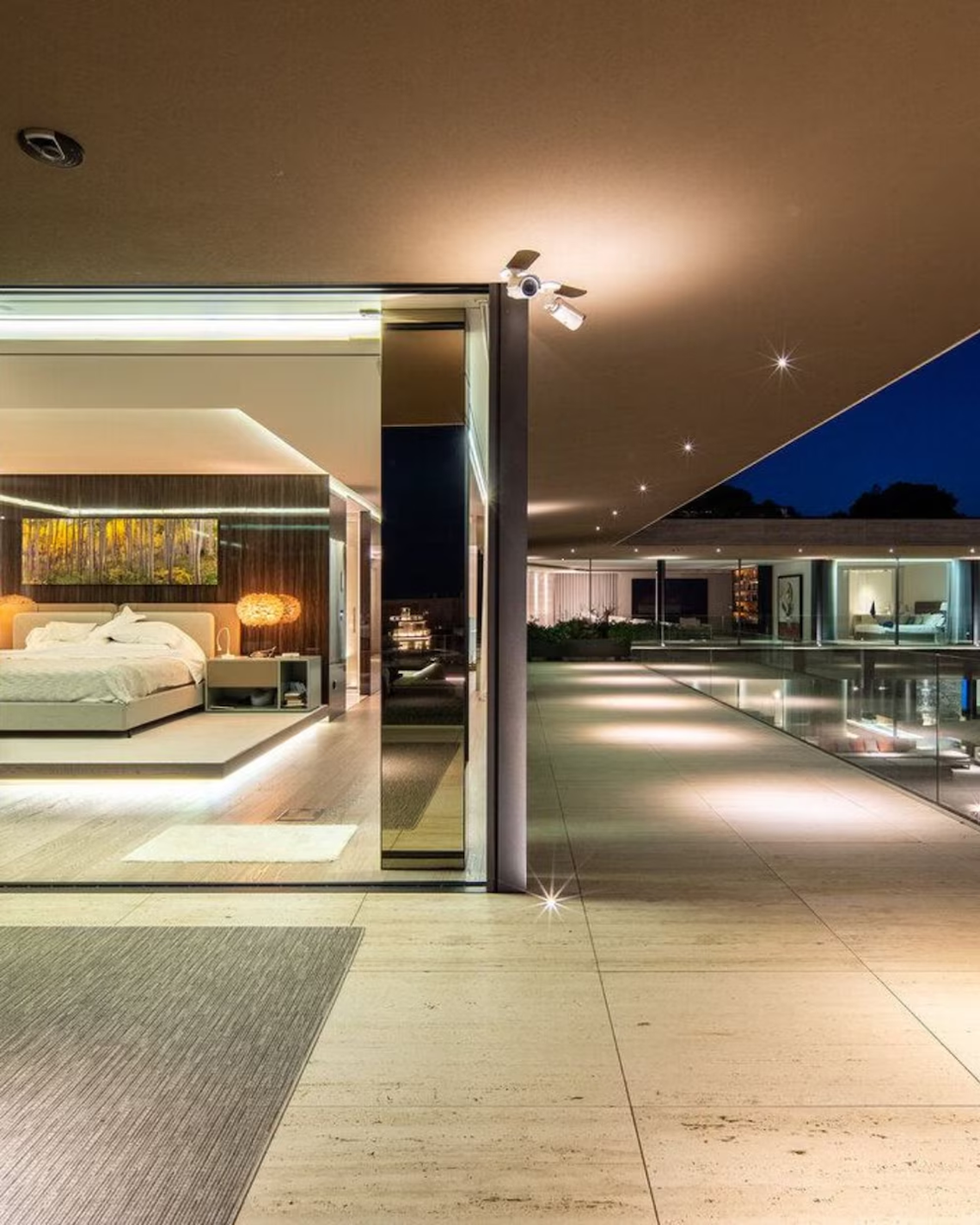 La pareja optó por mármol italiano para suelos y escaleras, maderas nobles y acabados de oro en griferías, primando una fusión entre lo clásico y el minimalismo contemporáneo. En el salón principal, un mural encargado a una firma de lujo funciona como sello artístico del hogar. Además, la propiedad incorpora un sistema centralizado que gestiona la iluminación, la climatización y la seguridad desde cualquier lugar, apoyado en paneles solares integrados en la cubierta.